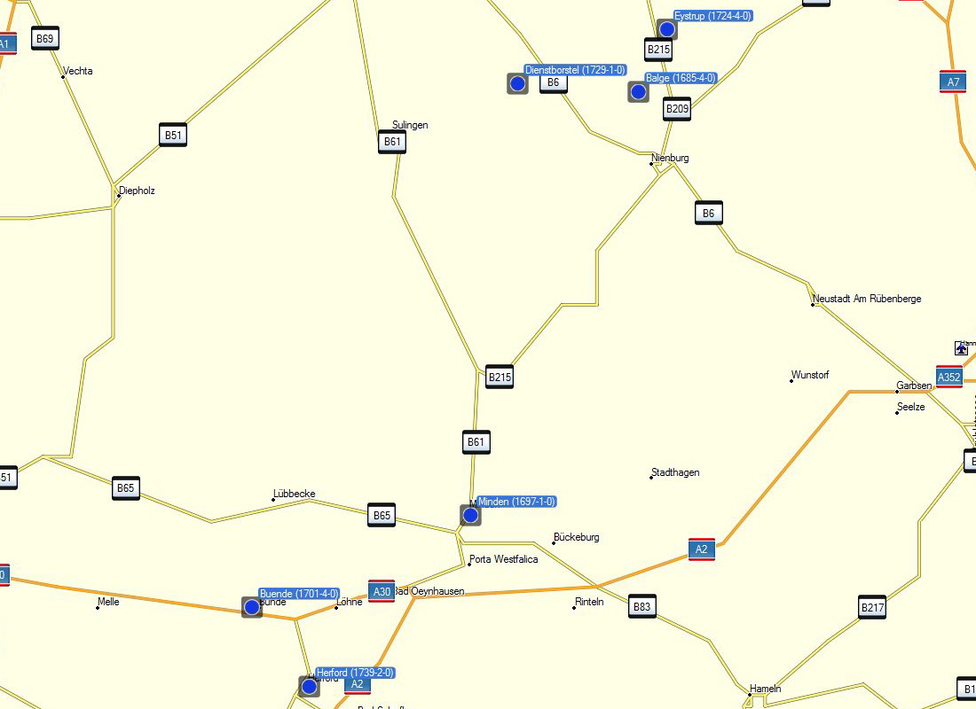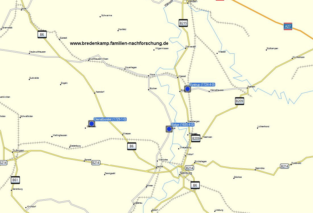 | Schwerpunkt-Region Raum Nienburg, in der seit 1685 Geburten und/oder Sterbefälle der Familie Bredenkamp erkannt worden sind |
