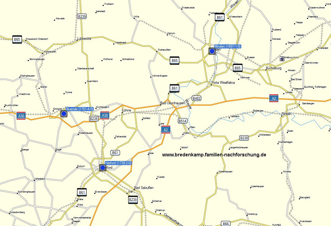 | Schwerpunkt-Region Raum Herford, in der seit 1697 Geburten und/oder Sterbefälle der Familie Bredenkamp erkannt worden sind |